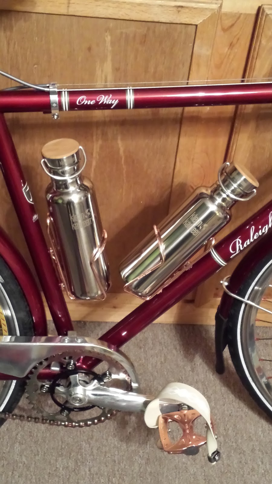 Okay, I admit maybe I overdid it......well, actually buying the Kleen Kanteen mirror finish bottles with the bamboo tops was actually going over the top since I probably wont ride with them, but I couldn't envision plastic bottles on this.